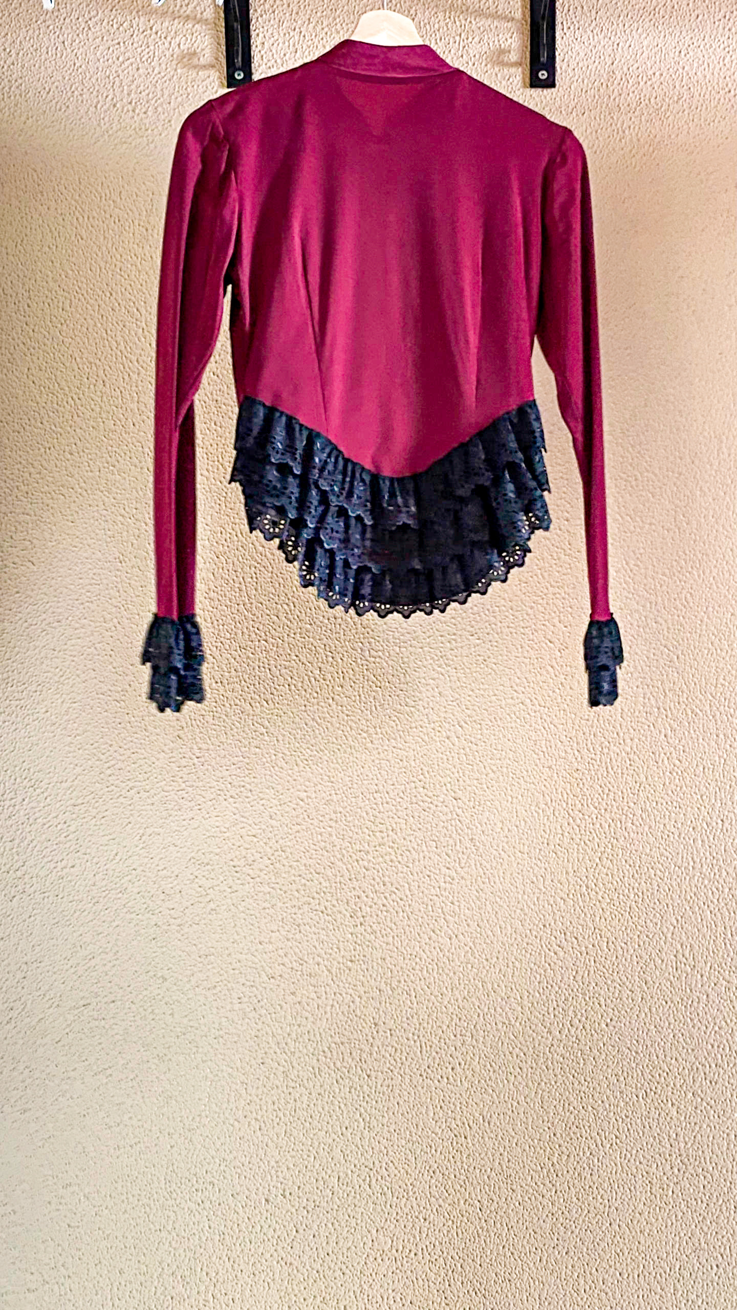 Burgundy lycra blouse with black embroidered strips. TAILOR-MADE.
