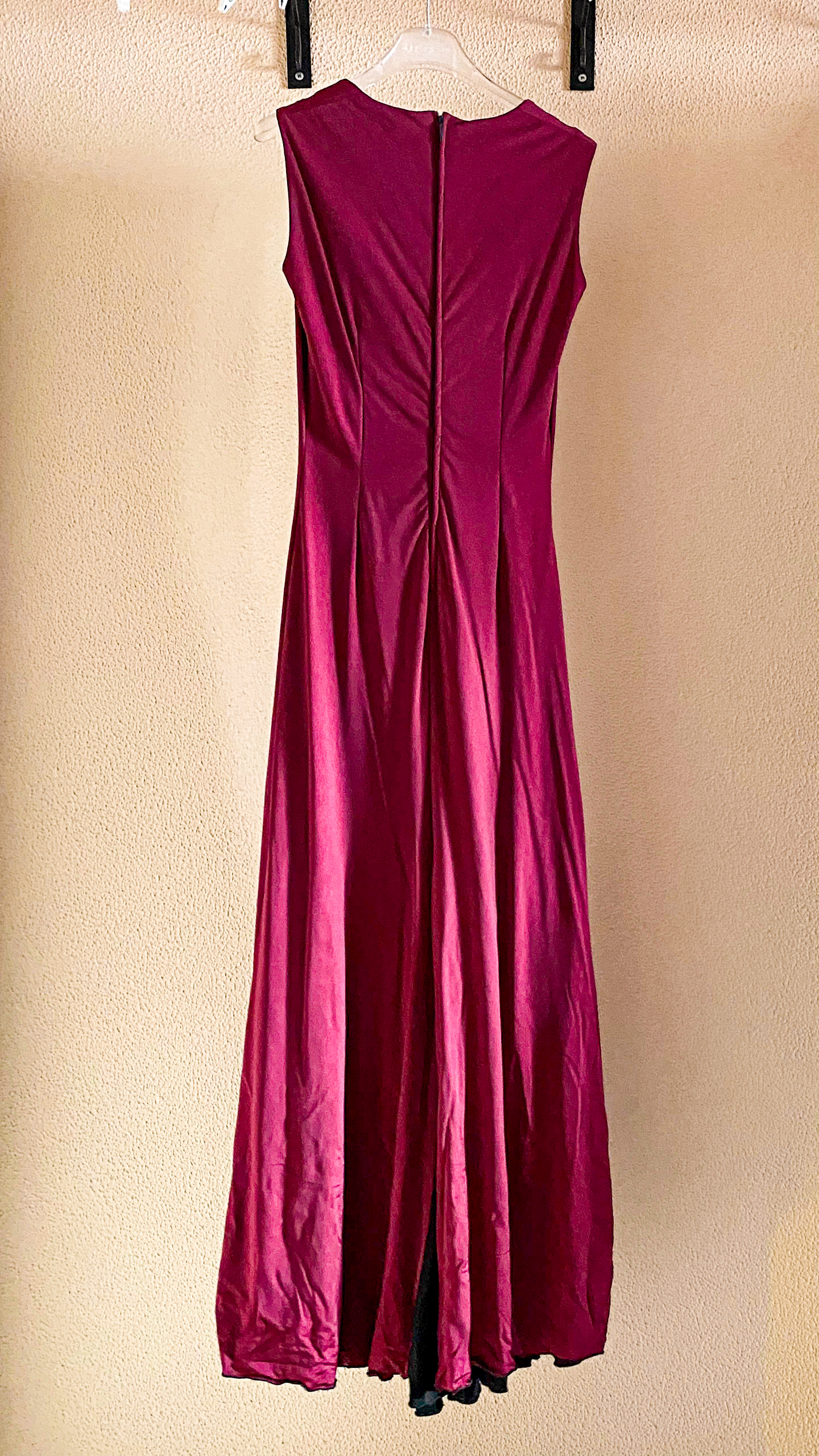 Sleeveless burgundy lycra dress with black embroidered strips. TAILOR-MADE.