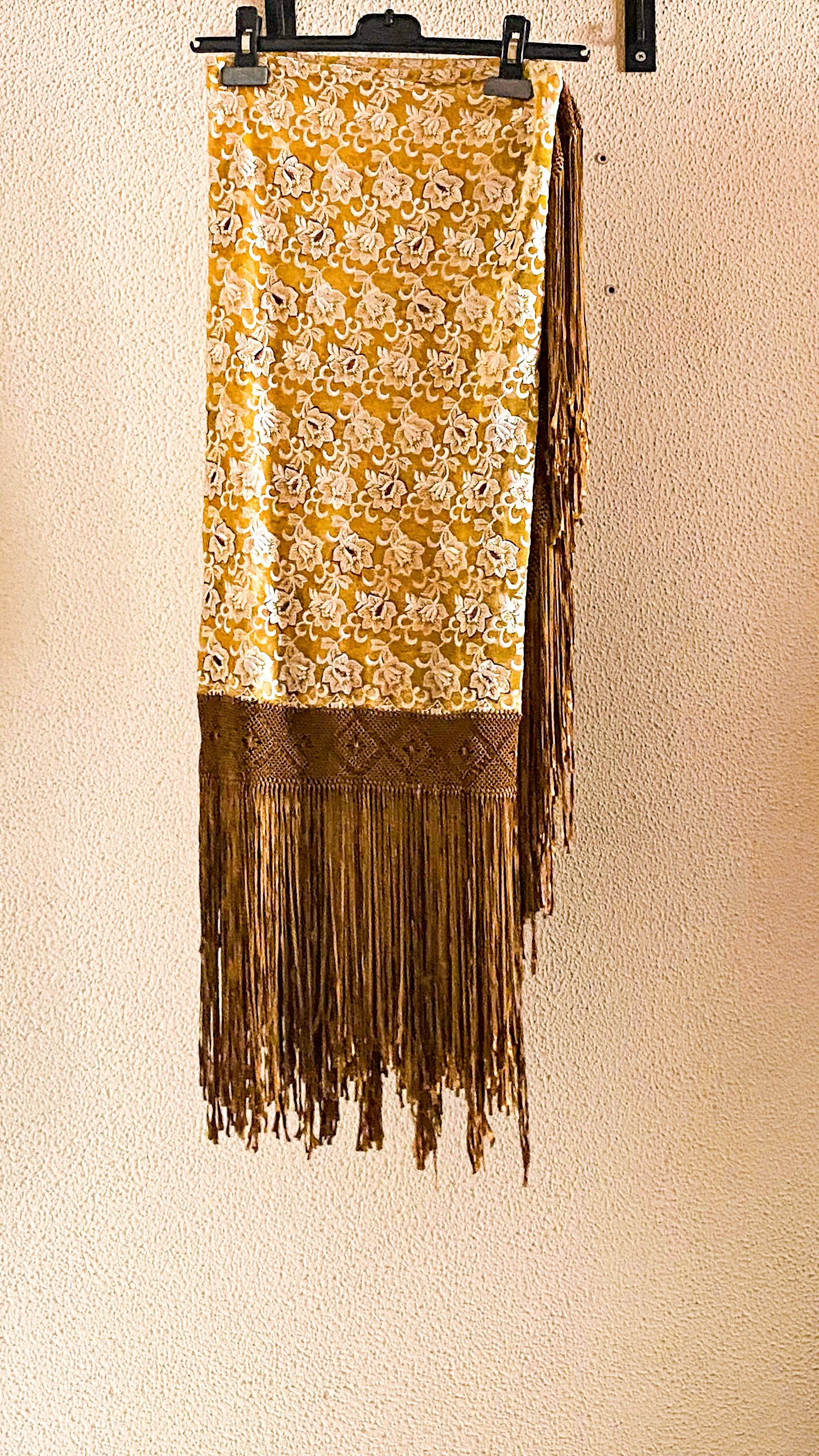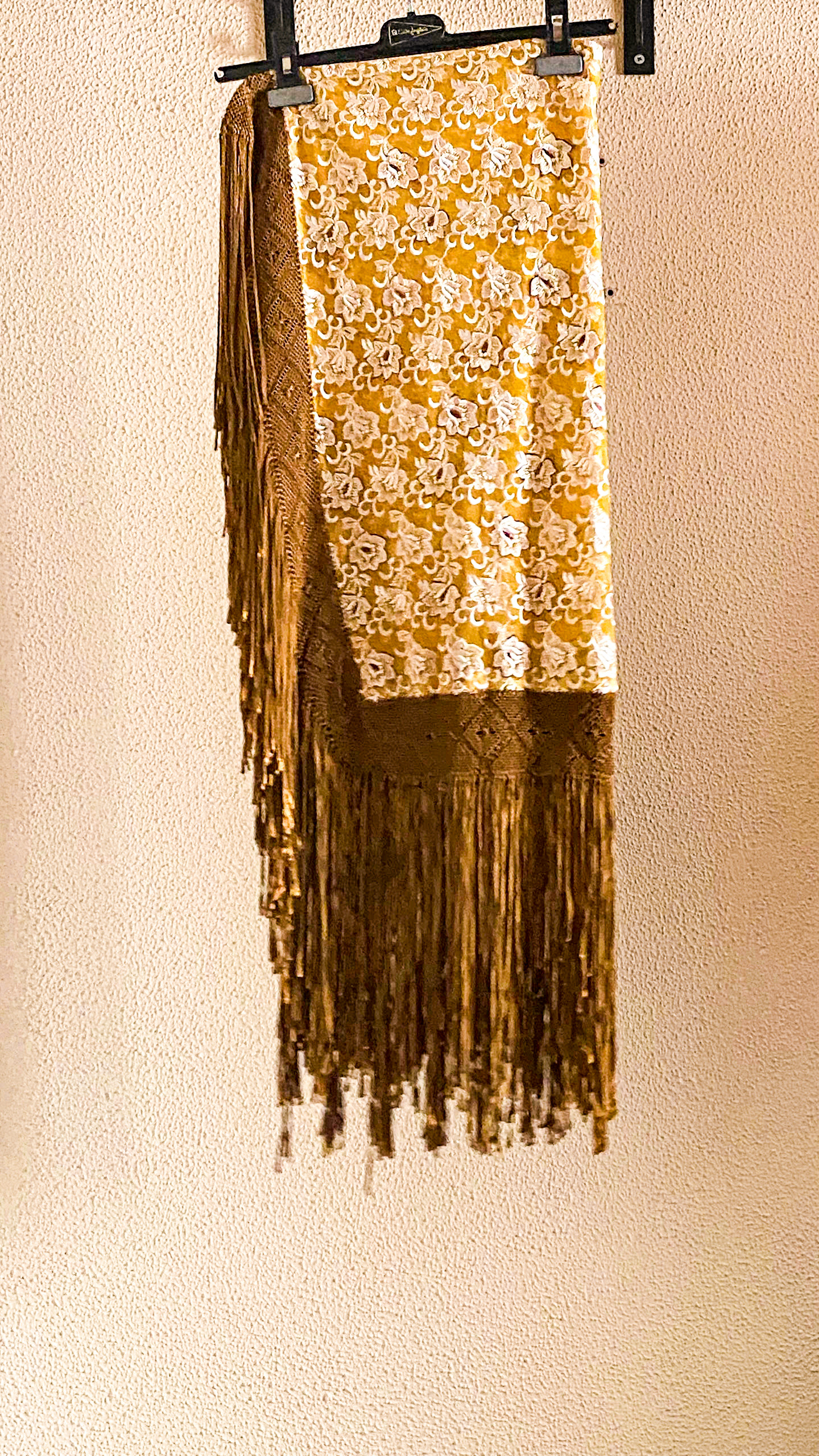 Rectangular Mantón with flat 'flecos'. New, never used.